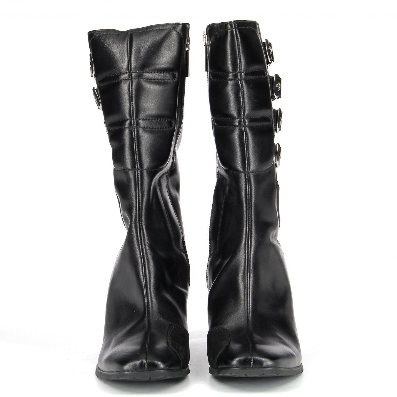 Hochwertiges Leder schützt die Füße vor Abschürfungen, während der Knöchel und die gepolsterte Innensohle für ein angenehmes Fahrgefühl sorgen. Die Absätze sind Metallplatten, die funktional erscheinen, aber es gibt vor allem einen Spritzer glänzendes Metall, um das (wie das Symbol es nennt) Menage-a-Quad-Schnallen-Design zu vervollständigen. Für die allgemeine Passform gibt es gerippte Wadenaufweitungseinsätze und ein Reißverschlusssystem
