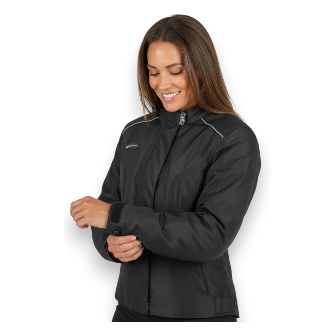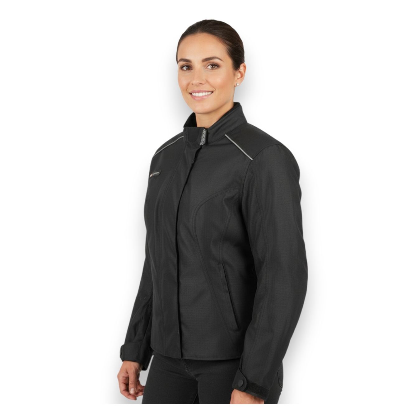 Polyester jacket with 100% waterproof breathable membrane with specific cut for women Detachable windproof schooner Standard accessories: Detachable full padded lining, removable EEC certified protections for shoulders, elbows and back- Brand
