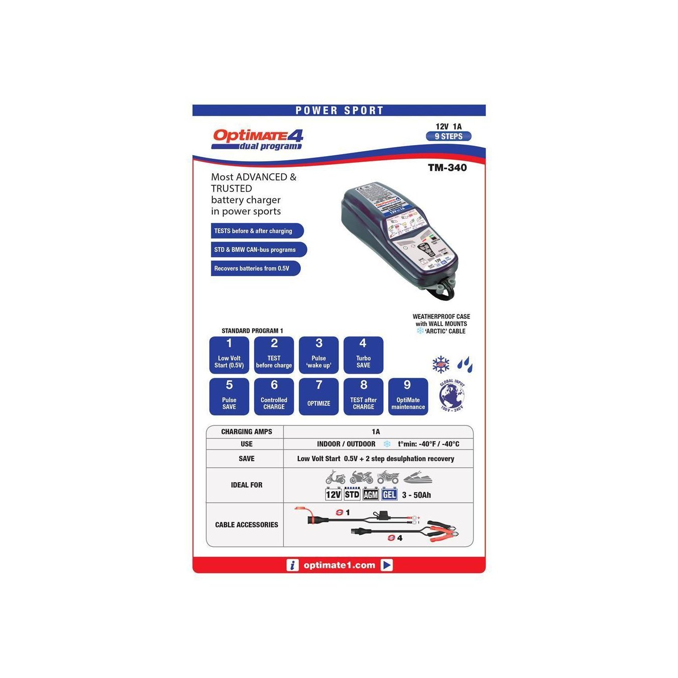 OptiMateTM4, the unique all-in-one tool for keeping 12V batteries at home, is now available with DUAL PROGRAM, which performs optimal diagnosis, recovery, charging, testing and automatic maintenance. With direct connection, or by selecting the program to charge via the 12V plug on motorcycles equipped with CAN-bus.Activation WITHOUT TOUCHING THE KEY: OptiMate 4 DUAL PROGRAM charges and maintains the battery automatically until it is disconnected. OptiMate 4 DUAL PROGRAM includes low-voltage pulse recovery mode for even more efficient recovery of neglected batteries, an easy-to-use battery test at connection, a stylish weatherproof housing with integrated mounting handles, and improved energy efficiency. Extending battery life to 400%, OptiMate 4 DUAL PROGRAM keeps the battery safe and ready to use for months.
