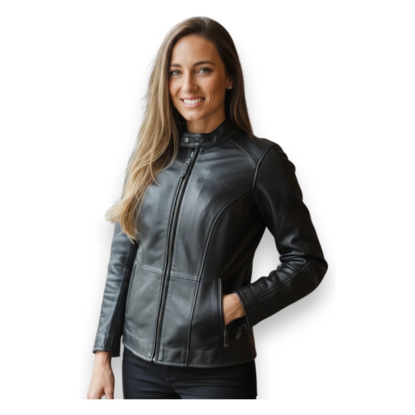 Chaqueta de cuero para mujer, atornillada en las protecciones de cintura, hombros y codos, ideal para todas las mujeres que buscan una prenda de piel que no sea demasiado deportiva.