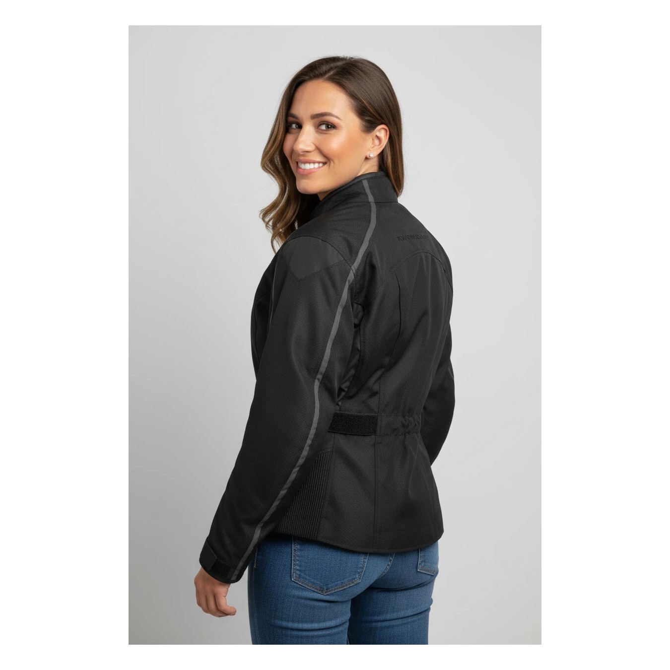 Veste 3/4 pour femme en tissu avancé ultra résistant à l’abrasion Membrane 100% imperméable et respirante Protections approuvées CE sur les épaules et les coudes amovibles Intérieur rembourré antigel avec panneaux respirants Ajustements des hanches Inserts en néoprène- Marque