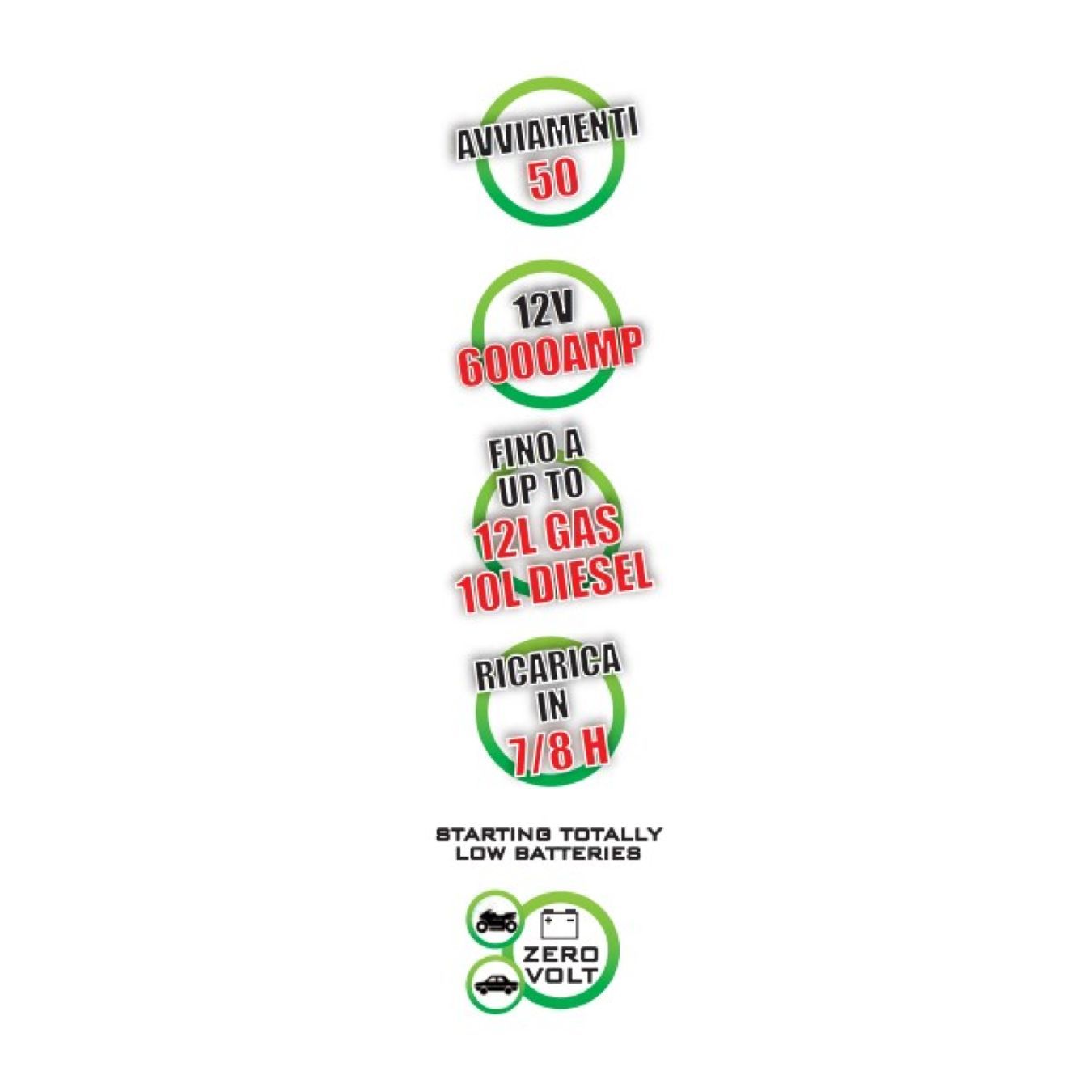 - * Compatto e portatile, può eseguire fino a 50 avviamenti per ricarica (batterie 12V).