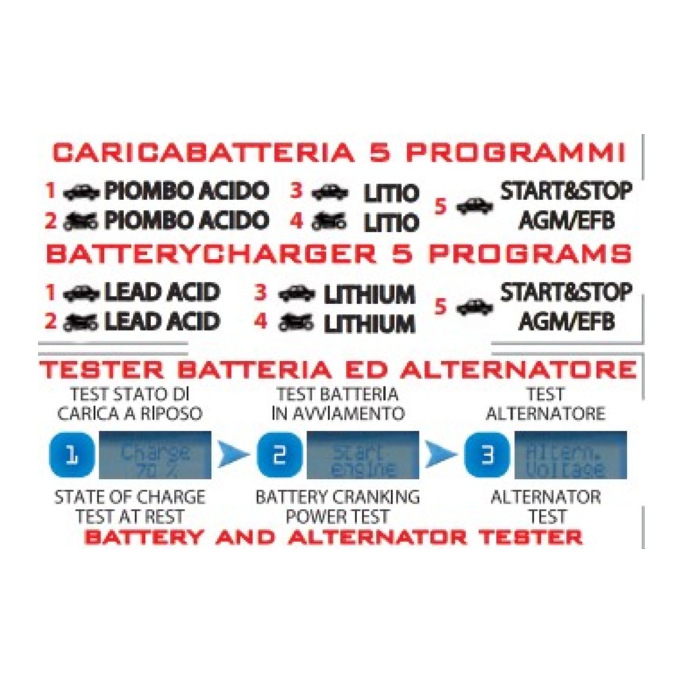 * Funzione tester batteria: esegue il test guidato della batteria (stato di carica e spunto) e del sistema di carica (alternatore/regolatore)