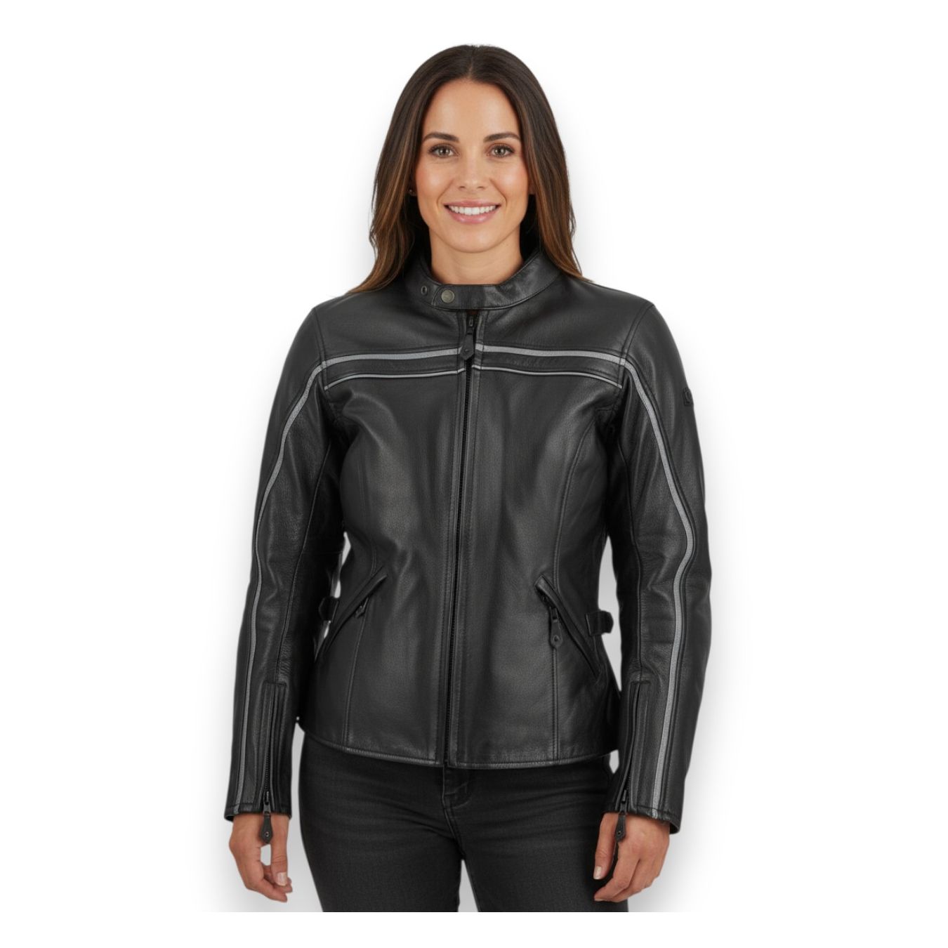 Giacca in pelle impermeabile al 100% con membrana, taglio specifico per donna, predisposta per protezioni spalle e gomito, attacco per con zip pantaloni. Per la taglia considerare che calza 2 misure in più (es: 46 italiana=42 Jfm)