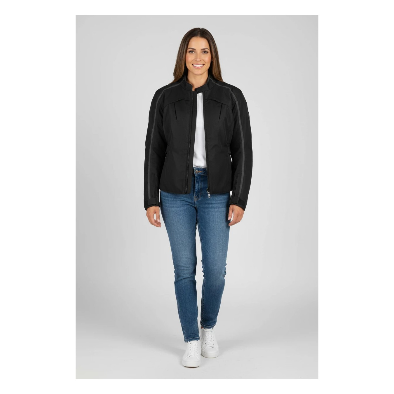 Giacca donna 3/4 in tessuto avanzato ultra resistente alle abrasioni Membrana impermeabile e traspirante al 100% Protezioni omologate CE su spalle e gomiti amovibili Interno imbottito termico Anti-freeze con pannelli traspiranti Regolazioni sui fianchi Inserti in neoprene