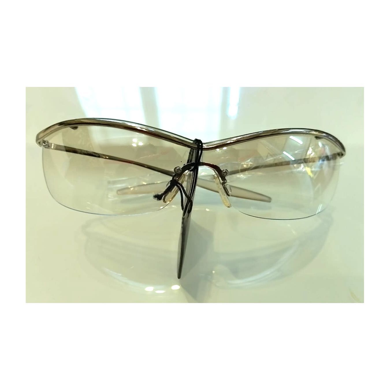 Il sottile filo di metallo cromato che sostiene la lente unica è la caratteristica principale di questo occhiale. Lente in policarbonato anti UV Terminali protetti da gomma antislide per il massimo comfort.